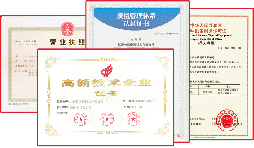 江西長征金屬制品有限公司,原大型航天軍工企業江西長征機器廠,是國家勞動部定點生產氣瓶的專業廠家。公司擁有雄厚的軍工技術力量,設備先進,檢測手段完備,按照GB/T5100標準和GB/T5842標準、GB/T17673標準要求,建立了嚴格的企業管理制度和完整有效的產品質量保證體系。
